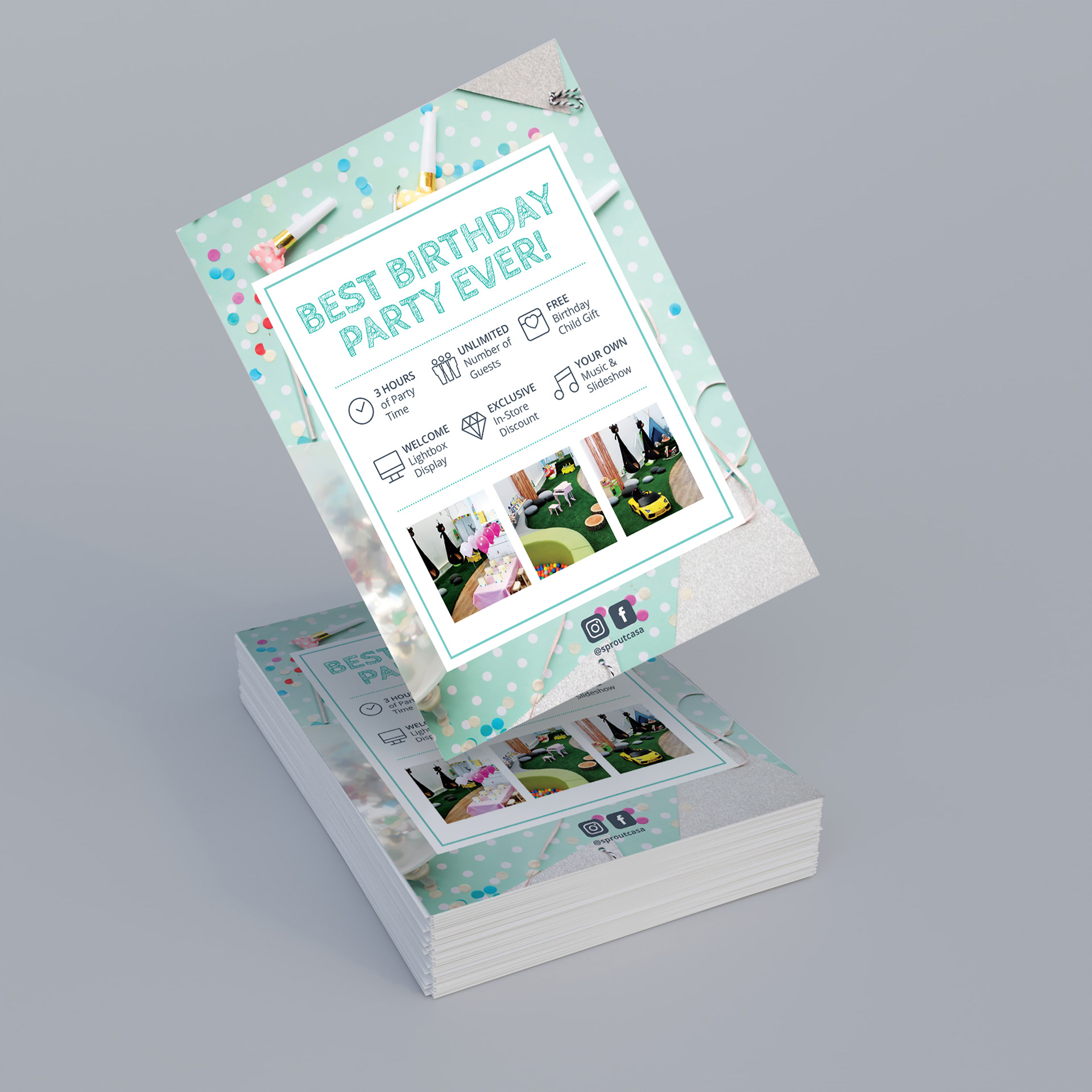 Sprout Concept is an online kids' store. They believe that children learn and foster creativity through play. As a result, they carefully select toys and products, prioritizing quality, enjoyment, and educational value. The logo and graphic pattern integrate sprout leaves alongside the brand's initials, S and C, effectively embodying the brand's mission of offering toys that nurture children's growth and development in an engaging manner. The design shows a balance between playfulness and sophistication, making the logo an emblem of quality and fun. The marketing material design has a common theme, colour, and style that allow customers to connect them to the brand.